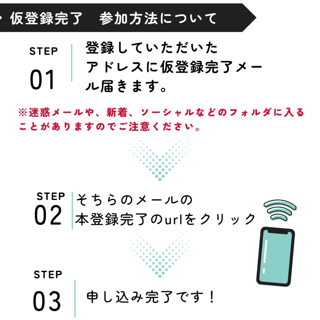 申し込み完了後、48時間以内にご予約確定連絡、もしくは参加方法などの詳細の連絡がございます。